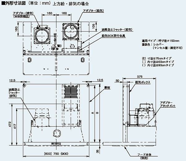 ●適用スリムフード:60cm幅用●吊戸棚対応高さ600mmサイズ:W:750×H:565mm色=シルバ− 用途台所 図面