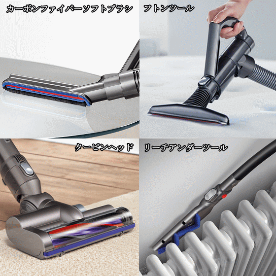 また、フトンツール、リーチアンダーツール、タービンヘッド カーボンファイバーソフトブラシツールなど様々な箇所を掃除できる 付属品も充実しました。