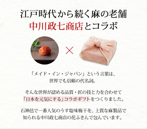特別大きな梅干しを十三代続く奈良の麻の老舗『中川政七商店』様の花ふきん(グッドデザイン賞受賞商品)に包みました。