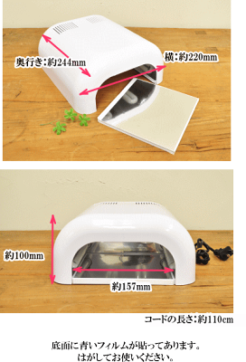 消費電力36w (使用ランプは9Wを4本) サイズランプ外寸(幅)約220mm×(奥行)約224mm×(高さ)約100mm タイマーの有無 有 : 120秒のタイマー付き(レジン作品によって硬化時間がことなりますので、120秒で硬化できるとは限りません。